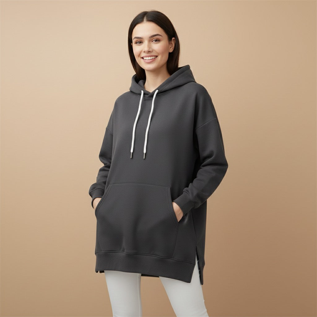 Ne choisissez plus entre être à l’aise et soignée : le MAXI HOODIE réinvente le basique avec une coupe oversize structurée. Sa matière douce et enveloppante apporte une agréable sensation de chaleur, tandis que ses fentes latérales offrent une aisance naturelle et un tombé fluide qui accompagne vos mouvements.